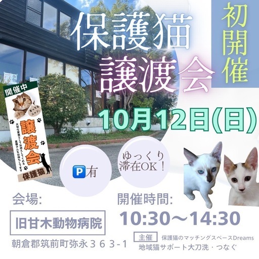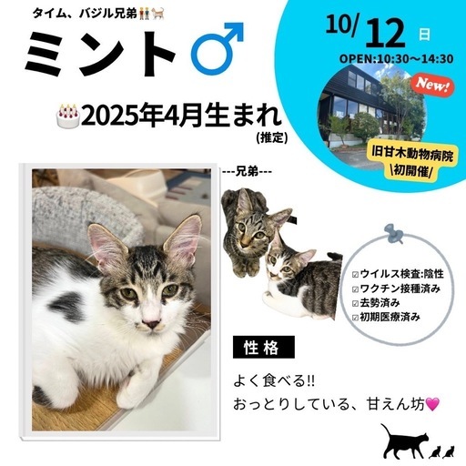 ◆性格や特徴*らー*男の子2024年9月生まれ【性格】甘えん坊でかまってちゃん♡スリゴロで可愛い鳴き方が特徴的です♪◆健康状態去勢済みウイルス検査:陰性ワクチン接種済み初期医療済み◆その他第1回【保護猫の譲渡会 旧甘木動物病院】日時:10/12(日)10:30〜14:30場所:旧甘木動物病院 朝倉郡筑前町弥永363-1※駐車場🅿︎有り※予約制ではありません※当日猫を連れて帰ることはできません-————♡—————