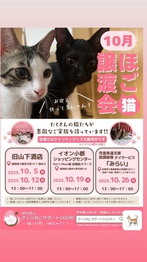 ◆性格や特徴ツンデレ女子生後6ヶ月なので、成長過程でかわります。子猫は順応性が高いのですぐに慣れます。◆健康状態エイズ・白血病陰性ノミダニ駆虫済み◆その他譲渡会に参加します。🐾旧山下酒店福岡県小郡市武13-7 駐車場あり2025.10.12(日)13: 00~17: 00🐾 イオン小郡ショッピングセンターPet's Mate様店舗前スペース福岡県小郡市大保弓場1102025.10.19(日)13:00~17:00🐾 児童発達支援放課後等デイサービス「みらい」佐賀県三養基郡基山町園部2821-1(国道17号線【同部IC】より車で2分)2025. 10.26(日)13:00~17:00会場が毎回変わりますので、ポスターでご確認ください🙇♀️①アレルギーは大丈夫ですか?②ご家族全員同意されていますか?③完全室内飼育のお約束をしていただけますか?その他譲渡までの流れについては面会時にご確認ください。 NPO法人さくらねこサポートOGORI 飼い主がいない事は確認済みです。