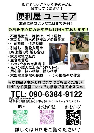 草刈りや草取り、庭木の剪定や伐採などお困りの方いらっしゃいましたらご相談ください✨便利屋のため他にも様々なお困り事に対応しております!詳しくはホームページをご覧ください https://y-itoshima.crayonsite.netジモティのメッセージやお電話でもお問い合わせ可能ですが、作業中や運転中のことが多いため公式LINEからのお問い合わせがスムーズです!公式LINEではクーポン配布中です!