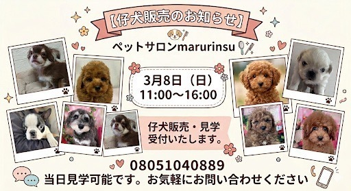 3月8日に 子犬の販売、見学会を行います。【仔犬販売のお知らせ】ペットサロンmarurinsu3月8日(日)11:00〜16:00仔犬販売・見学受付いたします。当日見学可能です。お気軽にお問い合わせください。