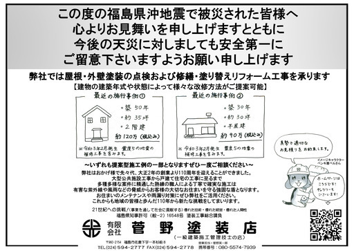 初めまして菅野塗装店と申します福島県福島市で営業している塗装工事の会社です創業は大正2年マンションや工場などの大規模塗装工事から個人住宅のリフォーム工事まで幅広くお仕事をさせて頂いております。弊社は大型公共施設や戸建て住宅のリフォームにいたるまで多種多様な案件に対応できる熟練のスタッフによる丁寧で確実な施工は有害な紫外線や風雨などの脅威からお客様の大切なお住まいを守る強固な盾となります。お住まいのメンテナンスや雨漏り対策にぜひ弊社をご活用ください!【建物の建築年式や状態によって様々な回収方法をご提案させていただきます】真摯で適切なお見積りをお約束いたしますぜひ一度ご相談くださいTEL:024-594-2777最新の情報や作業の様子は弊社のHPまたは公式ツイッターをご参照くださいHP https://kantosonew.business.siteTwitter https://twitter.com/Mi1hxzzUQuwFQ3c