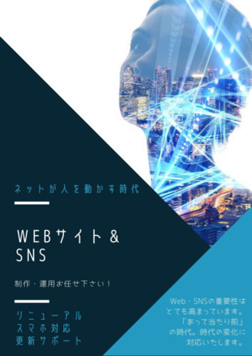 お客様の魅力を伝えるホームページ+SNS制作・運用お任せ下さい。ネットが人を動かす時代ホームページは「あって当たり前」時代の流れに対応しましょう!+SNSを活用すると流動率も上がりますので是非お試しください。「リニューアルを考えてる」「スマホ対応にしたい」「更新も任せたい」など、様々な悩みもあるかと思います。お気軽にご相談下さい。☆県内であれば直接お伺いしヒアリングから打ち合わせ等致しますのでご安心ください☆−−−−−−−−−−−−−−−−−−−−−−−−−−−−−−【ホームページ制作内容・価格表】 ①テンプレートホームページデザインが決まっており、お好みのホームページに仕上げます。価格:10万〜②オリジナルホームページ1から制作致します。価格:20万〜上記金額は目安になります。詳細はお問い合わせ時にご確認ください。【SNS対応種類・価格表】対応種類:YouTube、Twitter、Instagram、Facebook価格:1アカウント5000円運用費:1カ月5000円(月15投稿まで)その他①動画編集②ライティング③ブログ開設(WordPress)④ECサイト運営⑤コーディング依頼【個人での依頼も受付中】・副業を始めたいけどやり方が分からない・アフィリエイトをやりたい・YouTubeで動画配信をやりたい・ブログで稼ぎたいけど続かないやろうと思っても行動に移せない人が多いと思いますが、一緒に挑戦してみませんか?悩み相談も可能です。−−−−−−−−−−−−−−−−−−−−−−−−−−−−−−詳しい内容や価格はお問い合わせ下さい。ご連絡お待ちしております!