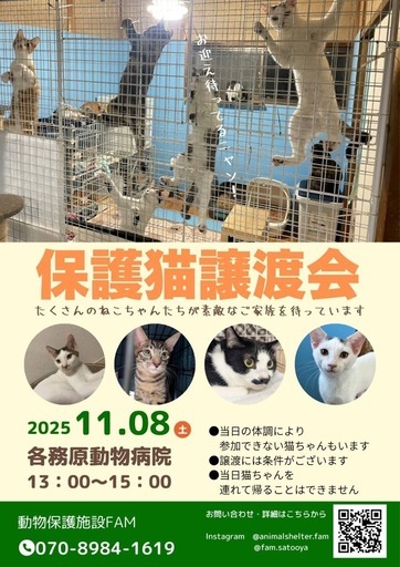 日時:11/8 13:00〜15:00場所:各務原動物病院各務原市那加信長町3-96人懐っこい子猫、成猫10匹ほどが里親さんをお待ちします!!ぜひ見に来てください!予約不要入場無料駐車場あり主催:動物保護施設FAMHP: https://animalshelter-fam-gihu.jimdofree.com/気になる子がいる方もご連絡ください☺️