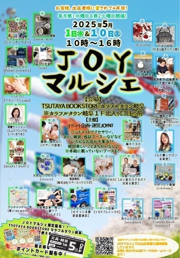 ☆★JOYマルシェ★☆Vol.70【2025年5月10日(土)10:00~16:00】JOYマルシェはおこさまや、ご家族連れに楽しい企画がいっぱい☆☆駐車場も広く入場無料のイベント!是非、お気軽に足をお運び下さい^_^〜販売ブース〜⚫︎アクセサリー(ハンドメイドみわ) ⚫︎アクセサリー、編みぐるみ(happy)⚫︎天然石アクセサリー(ekyuza)⚫︎かめクレイ雑貨(cibikame)⚫︎アクセサリー(Piasuree)⚫︎がま口財布(がま口屋きらり工房)⚫︎サンキャッチャー他WS(唯い-one and only-)⚫︎小物雑貨(Atelier Louis.)⚫︎色モノアクセサリー(aro.mame)⚫︎持ち込みラッピングとws (Cadeau fraise lebonheur)〜占いブース〜⚫︎手相、タロット他占い(占い屋おひさまのて百家&真世)⚫︎占い(心の癒しサロン彩氣堂)〜癒しブース〜⚫︎ウェルネス(AI姿勢診断、肩コリ、小顔ケア)⚫︎龍視、前世占い(かやこの部屋)⚫︎占い、霊視、お祓い、スピリチュアルアクセサリー(先読みの癒し手akemi&払い師ツネ)⚫︎霊視鑑定、波動整体(笑顔を届けるスピリチュアリスト神開己佳)〜生活ブースー⚫︎ハウスクリーニング(おそうじ本舗岐阜都通店)⚫︎オーラ診断(イルチブレインヨガ岐阜スタジオ)⚫︎相続、終活に関する無料相談(株式会社スペースハウスラボ)〜以下詳細〜■日程 2025/5/10(土)■開始 10:00■終了 16:00■場所 TSUTAYABOOKSTOREカラフルタウン岐阜■住所 岐阜県岐阜市柳津町丸野3丁目3−6 1F■駐車場 無料■入場無料■主催 イベント企画・運営JOYNT※次月開催日程⚫︎2025年6月5日(木)6月14日(土)⬇️JOYマルシェの出店詳細、お申し込みはこちらから⬇️ー2025年7月〜9月度まで募集中ー https://joynt-event.jimdofree.com/マルシェ-催事イベントページ/joyマルシェ出店詳細/#岐阜マルシェ #岐阜マルシェイベント #岐阜イベント #岐阜イベント情報 #岐阜遊び場 #東海マルシェ #お子様イベント #joyマルシェ #毎月第2土曜日 #毎月第1木曜日 #ハンドメイドアクセ #ハンドメイド雑貨 #ハンドメイドイベント #ハンドメイド出店 #占い好きな人と繋がりたい #占い好き #tsutayabookstore #ツタヤブックストアカラフルタウン岐阜店 #カラフルタウン岐阜 #joyntイベント #イベント