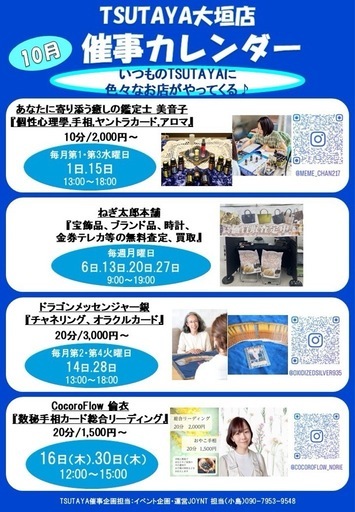 TSUTAYA大垣店2025年 10月催事スケジュール●毎月第1,第3水曜日(1日,15日)13:00〜18:00『あなたに寄り添う癒しの鑑定士 美音子』個性心理學、手相、ヤントラカード、アロマ@meme_chan217 ●毎週月曜日(6日,13日,20日,27日)9:00〜19:00『ねき太郎本舗』宝飾品、ブランド品、時計、金券テレカ等の無料査定、買取●毎月第2火曜日(14日,28日)13:00〜18:00『ドラゴンメッセンジャー銀』チャネリング、オラクルカード@oxidizedsilver935 ●16日(木).30日(金) 12:00〜15:00『CocoroFlow倫衣』数秘手相カード総合リーディング@cocoroflow_norie いつものTSUTAYAに色々なお店がやってくる!!・開催場所/TSUTAYA大垣店・住所/岐阜県大垣市本今町字西ノ側1639−1・無料駐車場あり気になるお店がある人はお気軽にお越しください♪2025年11月〜12月のTSUTAYA催事出店者様も受付中♪⚫︎大垣店⚫︎コスモブックセンター(恵那店)⚫︎桑名店⚫︎笹川店(四日市)⚫︎鈴鹿中央通店⚫︎半田店出店詳細確認、お申し込みはこちらから⇩ https://joynt-event.jimdofree.com/tsutaya平日催事ページ/#tsutaya催事 #joyntイベント #tsutaya大垣店 #占い好きな人と繋がりたい #癒し
