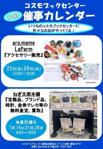 コスモブックセンター2025年10月催事スケジュールいつものTSUTAYAに色々なお店がやってくる!!⚫︎22日(水),29日(水)12:30〜16:30『aro.mame/LaParm』アクセサリー販売@aro.mame ●毎週火曜日(7日,14日,21日,28日)9:00〜19:00『ねき太郎本舗』宝飾品、ブランド品、時計、金券テレカ等の無料査定、買取・開催場所/コスモブックセンター・住所/ 岐阜県恵那市長島町中野2-1-15・無料駐車場あり気になるお店がある人はお気軽にお越しください♪2025年11月〜12月のTSUTAYA催事出店者様も受付中♪⚫︎大垣店⚫︎コスモブックセンター(恵那店)⚫︎桑名店⚫︎笹川店(四日市)⚫︎鈴鹿中央通店⚫︎半田店出店詳細確認、お申し込みはこちらから⇩ https://joynt-event.jimdofree.com/tsutaya平日催事ページ/#tsutaya催事 #コスモブックセンター#joyntイベント