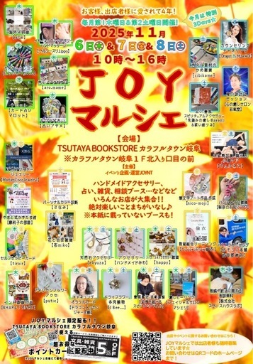 ☆★JOYマルシェ★☆Vol.80【2025年11月6日.7日.8日(木〜土)10:00~16:00】JOYマルシェはおこさまや、ご家族連れに楽しい企画がいっぱい☆☆駐車場も広く入場無料のイベント!是非、お気軽に足をお運び下さい^_^〜販売・WSブース〜⚫︎アクセサリー(ハンドメイドみわ) ※木金土⚫︎天然石アクセサリー(ekyuza)※木金土⚫︎シーグラスアクセサリー雑貨(happy)※木金土⚫︎ドライフラワー、多肉植物(I Bee...)※木金土⚫︎天然石ワイヤージュエリー(Madam Coco Jewelry)※木金⚫︎インド直買付品(BHARAT MART)※木金⚫︎ハンドメイド雑貨(桜奈のお気に入り)※金土⚫︎色モノアクセサリー(aro.mame)※木⚫︎カスタムクレヨン(こといろクレヨン)※木⚫︎海外子供服(aluk)※木⚫︎花と合皮雑貨(布miko)※金⚫︎筆文字アート作品,作成(nico-moji)※金⚫︎アメリカンフラワー、アクセ(putie)※金⚫︎色々な素材のかめ雑貨(cibikame)※土〜占いブース〜⚫︎やまと式かずたま術(摩利子の部屋)※木金⚫︎セルフセラピーカード(tiroir)※木金⚫︎タロット(カード占いマロっト)※木⚫︎タロット占い(占いアヤメ)※木⚫︎手相と数秘総合リーディン(CocoroFlow)※金〜癒しブース〜⚫︎霊能相談、ヒーリング(霊能者chica)※木金土⚫︎チャネリング、オラクルカード(ドラゴンメッセンジャー®︎銀)※木金土⚫︎癒しヒーリング(フェイシャルサロンマシェリ)※木金土⚫︎AI姿勢診断&肩コリ、小顔ケア(ウェルネス)※金土⚫︎ハンドマッサージ、ヘッドスパ(ヘルシースリムippo)※木金⚫︎パーソナルカラー診断(さなみ)※金⚫︎占い、霊視、スピリチュアルアクセサリー(先読みの癒し手akemi&払い師ツネ)※土⚫︎霊視鑑定、波動整体(笑顔を届けるスピリチュアリスト榊原己佳)※土⚫︎魂の設計図セッション(心の癒しサロン彩氣堂)※土⚫︎ カウンセリング、チャネリング(Dragon Muse AOI)※土〜生活ブースー⚫︎ハウスクリーニング(おそうじ本舗岐阜都通店)※金土⚫︎相続や終活に関する無料相談(株式会社スペースハウスラボ)※木土〜以下詳細〜■日程 2025年11月6日(木).7日(金).8日(土)■開始 10:00■終了 16:00■場所 TSUTAYABOOKSTOREカラフルタウン岐阜■住所 岐阜県岐阜市柳津町丸野3丁目3−6 1F■駐車場 無料■入場無料■主催 イベント企画・運営JOYNT※次月開催日程⚫︎2025年12月4日(木)13日(土)⇩JOYマルシェの出店詳細、お申し込みはこちらから⇩ https://joynt-event.jimdofree.com/マルシェ-催事イベントページ/joyマルシェ出店詳細/#岐阜マルシェ #岐阜マルシェイベント #岐阜イベント #岐阜イベント情報 #岐阜遊び場 #東海マルシェ #お子様イベント #joyマルシェ #毎月第2土曜日 #毎月第1木曜日 #ハンドメイドアクセ #ハンドメイド雑貨 #ハンドメイドイベント #ハンドメイド出店 #占い好きな人と繋がりたい #占い好き #tsutayabookstore #ツタヤブックストアカラフルタウン岐阜店 #カラフルタウン岐阜 #joyntイベント #イベント