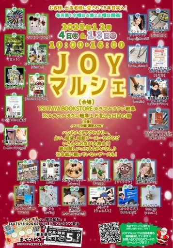 ☆★JOYマルシェ★☆Vol.82【2025年12月13日(土)10:00~16:00】JOYマルシェはおこさまや、ご家族連れに楽しい企画がいっぱい☆☆4年間続いている人気マルシェです!!駐車場も広く入場無料のイベント!お気軽に足をお運び下さい♪〜販売ブース〜⚫︎海外子供服(aluk)⚫︎天然石アクセサリー(ekyuza)⚫︎シーグラスアクセサリー雑貨(happy)⚫︎ドライフラワー、多肉植物(I Bee...)⚫︎色モノアクセサリー(aro.mame)⚫︎アメリカンフラワー、アクセ(putie)⚫︎色々な素材のかめ雑貨(cibikame)⚫︎アクセサリー(twin_sheep)⚫︎刺繍やビーズ小物、アクセサリー(sorella)〜占いブース〜⚫︎インド占星術(シュクリヤ)〜癒しブース〜⚫︎AI姿勢診断&肩コリ、小顔ケア(ウェルネス)⚫︎癒しヒーリング(フェイシャルサロンマシェリ)⚫︎霊能相談、ユナリア(霊性活動家chica)⚫︎カウンセリング、チャネリング(Dragon MuseAOI)⚫︎パーソナルカラー診断、似合う髪型診断(さなみ)⚫︎霊視鑑定、波動整体(笑顔を届けるスピリチュアリスト榊原己佳)〜生活ブースー⚫︎ハウスクリーニング(おそうじ本舗岐阜都通店)⚫︎相続や終活に関する無料相談(株式会社スペースハウスラボ)〜以下詳細〜■日程 2025/12/13(土)■開始 10:00■終了 16:00■場所 TSUTAYABOOKSTOREカラフルタウン岐阜■住所 岐阜県岐阜市柳津町丸野3丁目3−6 1F■駐車場 無料■入場無料■主催 イベント企画・運営JOYNT※次月開催日程⚫︎2026年1月8日(木).9日(金)10日(土)⇩JOYマルシェの出店詳細、お申し込みはこちらから⇩※2026年3月度まで募集中 https://joynt-event.jimdofree.com/マルシェ-催事イベントページ/joyマルシェ出店詳細/#岐阜マルシェ #岐阜マルシェイベント #岐阜イベント #岐阜イベント情報 #岐阜遊び場 #東海マルシェ #お子様イベント #joyマルシェ #毎月第2土曜日 #毎月第1木曜日 #ハンドメイドアクセ #ハンドメイド雑貨 #ハンドメイドイベント #ハンドメイド出店 #占い好きな人と繋がりたい #占い好き #tsutayabookstore #ツタヤブックストアカラフルタウン岐阜店 #カラフルタウン岐阜 #joyntイベント #イベント