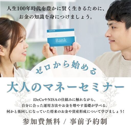 金融リテラシーは「お金に関する知識と判断力」のこと。大人にとっては、単なる知識ではなく、人生の選択を支える“生きる力”とも言えます。 iDeCoやNISAの仕組みに触れながら、自分に合った運用方法やお金を増やす基礎が学べる。何かと後回しになっていた将来のお金や資産形成について学びましょう!時間的には、約90分程度で予定しております。お茶を飲みながらゆっくりとリラックスして聞いていただければと存じます。 人生100年時代を豊かに賢く生きるために、お金の知識を身につけましょう。 NISA・iDeCoの基本的な仕組みやメリット・デメリット、投資のリスクを抑えて運用する方法、ファンドの種類や基本的な選定方法をお伝えします。 金融リテラシーは「自分と家族の未来を守る力」 知識があることで、ムダを減らし、安心を増やす選択ができるようになります。【開催日時】9月20日(土曜日) 10:00~12:009月27日(土曜日) 10:00~12:00↓↓↓↓↓ 大人のマネースクール概要 ↓↓↓↓↓※お申し込み関しても、コチラからお願いいたします。 https://kms-anshin-fp.my.canva.site/anshin-fp