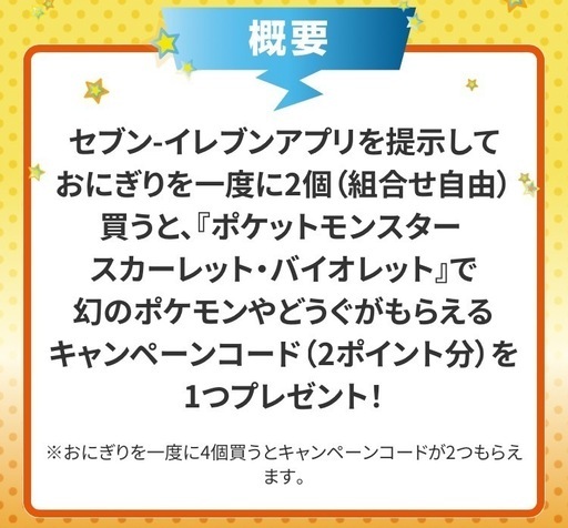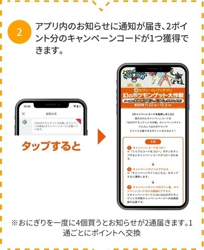 本日から始まった【幻のポケモン ゲット大作戦】のキャンペーンコードを譲って頂きたく投稿しました。セブンイレブンアプリを提示しておにぎりを2個買うと24時間以内にアプリ内の通知欄にてキャンペーンコードが届きます。セブンイレブンアプリはよく利用するけどポケモンには興味が無い方がいらっしゃいましたらご検討お願いします。もちろんセブンイレブンアプリ以外のキャンペーンコード(ポケモンパンやポケモンカード、コロコロコミックなど)も募集しています。キャンペーンコードは問い合わせにて教えてください。コードの確認ができましたら良評価させて頂きます。よろしくお願いします。