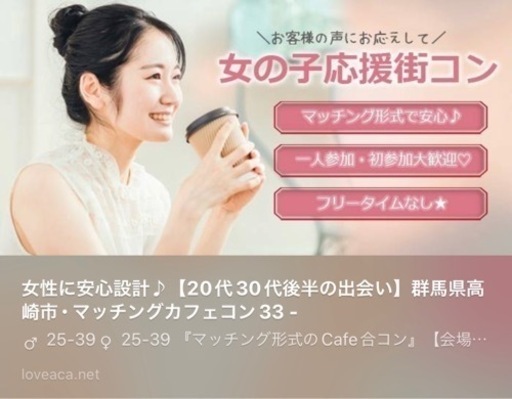 ❤️4月14日曜❤️15時〜 ✨開催確定✨マッチングカフェコンin高崎駅近⭐️男性急募⭐️男性25〜39歳まで(±1歳は🆗)現在20名以上で女性12名以上で先行中♪男性6000円デザート・ドリンクバー付✨お申込みは私まで✨⭐️10年以上パーティ開催実績あり⭐️⭐️街コンジャパンが選ぶお客様満足度日本1位⭐️⭐️オミカレさんが選ぶ関東3位⭐️⭐️是非当社に合コンや婚活をお申込み下さい⭐️⭐️詳細は下記をご覧下さい⭐️ https://loveaca.net/event/takasaki-cafekon33-2/