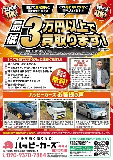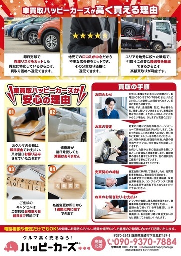 地域密着🌈ハッピーカーズ高崎北店です!ご覧いただきありがとうございます!高崎市を中心に、群馬県内どこでも出張無料査定&高価買取を行っています。✅ 動かない車でもOK✅ 事故車・不動車・車検切れ歓迎✅ 廃車手続き代行も可能✅ 即日対応・現金払い・普通車最低3万円💰・軽自動車最低1万円💰※状態によっては買取保証対象外となります。「売りたいけどお店に持って行くのが大変…」「できるだけ高く売りたい!」「一括査定はやりたくない!」「すぐにお金に変えたい!」「下取り査定で0円と言われた」そんな方はぜひご相談ください😊📱 写真をLINEで送るだけで査定可能!LINE: https://lin.ee/4BSybl4皆様からのご連絡お待ちしております⭐️※圧迫するような無理な営業や買取は致しませんのでご安心してください。車に詳しい人くらいに思ってご相談いただければ幸いです🤭主な出張エリア(下記エリア以外でも相談下さい)群馬県高崎市、群馬県安中市、群馬県渋川市、群馬県榛東村、群馬県吉岡町、群馬県藤岡市、群馬県甘楽町、ホームページ📄 https://happycars.jp/store/takasaki-kita/「車を通じて関わる人すべてに幸せを」