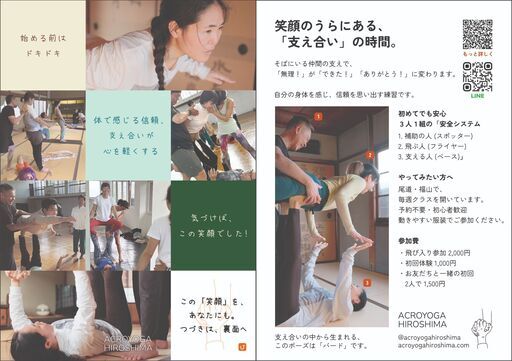 ひとりでは味わえない「支え合う」体験を、やさしく・ゆっくり楽しんでみませんか?アクロヨガをベースにしたパートナーワークで、体と心がふっと軽くなる時間を一緒に作っています。・激しい運動ではありません・年齢・経験は問いません・おひとり参加大歓迎です・男女問わず参加しやすい雰囲気です(※ 写真のように、かんたんな協力動作やサポートが中心です)⸻🌿 どんな活動? • 2人で支え合いながら、やさしく体を動かす • 失敗しても笑える“遊び心”の時間 • 日常ではなかなか味わえない安心感 • ゆるくつながる、大人のやさしいサークルクラスというより「一緒に試してみる場所」に近い雰囲気で、初めての方でも自然になじめます☺️⸻🗓 活動日毎週水曜日 18:30〜20:00(福山)※ 都合の良いときだけの参加でOKです※ 12月31日はお休みです⸻📍 場所福寿会館(JR福山駅より徒歩5分)静かな和室でのびのび動けます。写真に道順や目印も載せています📸Google Map → https://maps.app.goo.gl/7v4gukyj2j35gE4KA⸻📞 言語について講師は日本語を勉強中のため、お電話よりメッセージのほうが確実にご案内できます🙏お気軽にメッセージください。⸻💰 参加費体験 1,000円通常 2,000円友だちと一緒の初回は 2人で1,500円(サークルですが、場所代の関係で少額の参加費をいただいています)⸻📩 お問い合わせ / 参加希望JMTYメッセージ、またはメールでどうぞ。hello@acroyogahiroshima.com「見学だけ」でも大丈夫です。気になる方は、まずは気軽にご連絡くださいね☺️⸻❄️ 最後に支え合う安心感って、大人になるとなかなか触れる機会がありません。ここでは、がんばらずに、ゆるく、でも“確かにつながる”時間があります。お待ちしています。