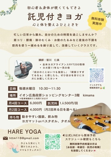 ✴︎託児付きヨガ✴︎産後の身体と心の不調にお悩みのママさん集合〜!ヨガで一緒に身体と心を整えましょう♡日時:毎週水曜日 10:30〜11:30場所:イオンモール広島段原ショッピングセンター 3階 kimama (駐車場2時間無料)🍀初回無料体験実施中🍀【通われる場合】🧘♀️月4回コース月額6,000円🧘選べる月2回コース月額4,000円👶託児料1人500円(1回)✔︎月ごとに継続するかどうか選べる✔︎安心の少人数制✔︎初めて・身体が硬くても大丈夫👌【ヨガの効果】●自律神経の乱れを整える👉子どもへのイライラ⚡︎が減り、気持ちにゆとりが生まれる●肩こり・腰痛・反り腰・骨盤底筋の緩み・足のむくみなどの不調の予防&解消👉家事・育児が楽になる👉子どもに負けない体力・スタミナがつく●産後のケア・体型戻し👉骨盤まわりを整えて出産前の身体に近づける●自分だけのリフレッシュ時間👉【ママ】ではなく【自分】に戻れる貴重なひととき【お問い合わせ・お申し込み】公式LINE https://lin.ee/nYh7ruOお友達追加いただくと毎月のイベント情報を配信します☺️無料体験のお申し込み希望の方は、【無料体験希望日・お名前・託児の有無】を記入の上メッセージをお送りください💌