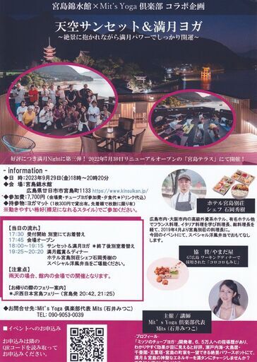 「天空サンセット&満月ヨガ」@宮島テラス~絶景に抱かれながら 満月パワーでしっかり開運~2022年7月30日に錦水館さん屋上にオープンした新パワースポット「屋上テラス」で開催!G7サミット尽くしの内容でお届け♡<開催詳細>◆日 時:9月29日(金)18時〜20時20分◆会 場:宮島錦水館(廿日市市宮島町1133) TEL 0829-44-2131 https://www.kinsuikan.jp/◆参加費:7,700円(会場費・ヨガ参加費・夕食代(アルコールドリンク込)◆持参物:ヨガマット貸出有(先着順で数枚のみ)※動きやすい格好(裸足になれるスタイル)でご参加ください。◆定 員:20人(お申込先着順となります)<当日の流れ>17:30 開始→別室にてお着替え17:45 会場オープン18:00〜19:15 「サンセット&満月ヨガ」(終了後別室でお着替え)19:25〜20:20 満月鑑賞&ディナー※満月鑑賞を楽しみながら宮島別荘カリスマ石岡秀樹シェフの スペシャル洋風お月見お弁当をご堪能下さい。 (アレルギー食材の有無など事前にお伺い致します。)【注意点】雨天の場合、館内会場での開催となります。【お帰りのフェリー時刻ご案内】 JR西日本宮島フェリー(宮島発→20時42分、21時25分)◆セールスポイント↓「G7広島サミット」尽くしの内容になりますよ~♬♬➀G7広島サミット時、厳島神社からの中継で美し過ぎた「夕陽」(水面にゴールデンロードが出現してましたよね)を絶景を贅沢にも、錦水館さん屋上の「宮島テラス」から臨めます。②G7広島サミット時ワーキングディナーで採用された「コロコロもみじ」をやまだ屋さんがご協賛下さいます。③お料理を担当下さるホテル宮島別荘の石岡秀樹シェフはG7広島サミット時にワーキングランチお料理の監修・提供に携われています。瀬戸内海・大鳥居・千畳閣・五重塔・宮島の町家を一望できる唯一無二の「絶景パワースポット」にて、満月&宮島の神聖なエネルギーを満タンにチャージしませんか? 詳細&お申込はこちらから↓↓ https://ticket.tsuku2.jp/events-detail/42233212103400