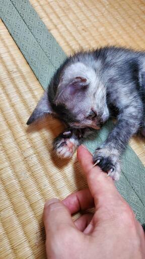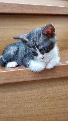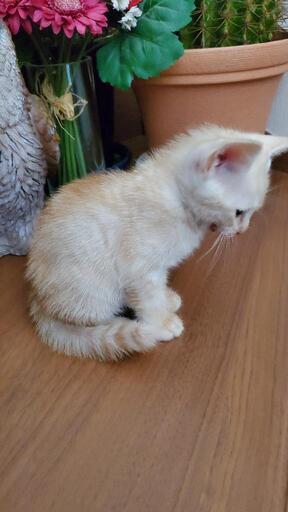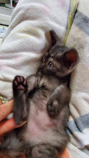 分かりにくいですが 子猫特有の青い目から少し青みが変わってきているので生後2ヶ月近くになると思われます。