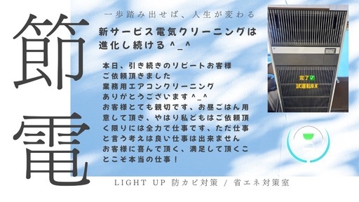 業界特化した【新サービス電気クリーニング】大好評😊【電気代大幅削減実現】❇️エアーミスト洗浄登場本当のエアコンクリーニングとは!日々お世話になっております。LIGHT UP電気空調設備工事でございます✨LIGHT UP電気空調設備工事です🔧さあ今行動、地球温暖化対策、電気代大幅削減実現♻️🌏20年後を考えたことございますでしょうか?日本の夏の平均気温40度〜45度だからこそ今からでも行動ご家庭の中で一番にエネルギー量多いエアコン✅新サービス電気クリーニング真の力♻️・エアコン取外しクリーニング・エアコン本体裏側までクリーニング・室外機同時に掃除・エアコンパイプ劣化確認・取付箇所の壁腐食調査・エアコン洗浄完了後、最終仕上げエアーにて 水分残らず飛ばす・すべて確認し取付✅新たなサービス室外機冷却化 夏場の室外機はかなりの暑さ故障寸前までの 熱を持ちます、そこで弊社独自技術室外機冷却✅【室外機の熱はかなりの確率で冷える】 ✨室外機冷却工事行っております👷私は地球温暖化に投資行う。人は地球に守られている、温暖化対策にお金使う未来の子供たちの生活を想像することが重要🌏未来への道づくり出来る人こそ信念がある✨✅少しの力が皆が行うことで大きな力となる🌏新しい機器を作ればそれで良いではない!その機械がまた、処分される時温暖化影響となる!何卒お気軽にお問い合わせくださいね☆新サービス電気クリーニングで検索🔍