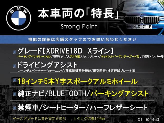 BMW X1 xDrive 18d xライン 純正ナビ バックカメラ 18インチ5本Y字スポークアルミホイール クロストラック革コンビシート パーキングアシスト 禁煙車 シートヒーター BLUETOOTH スマートキー クリアランスソナー ETC (検8.9) (投稿ID : g_965025111609900166005)