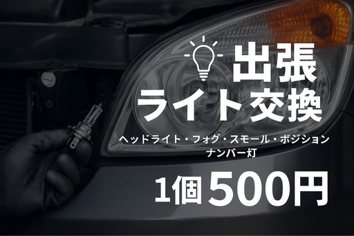 ヘッドライト・フォグ・スモール・ポジション・ナンバー灯対応!「自分でやるの難しい」「ネジが固くて外せない」そんな方へ💡出張でライトの球交換を行います!(持ち込みOK)⸻💰料金1ヶ所:500円(税込)※出張費込み※現金 or PayPay対応⸻🕓対応時間📅 毎週日曜日(予約制)①8:00〜18:00🌙 平日18:00〜22:00も対応OK!⸻🧩対応箇所・ヘッドライト(ロービーム/ハイビーム)・フォグランプ・スモール/ポジションライト・ナンバー灯※HID・LED化など特殊な作業は別途応相談⸻⚠️注意事項・球はお客様でご用意ください(こちらで取付のみ対応)・一部車種でバンパー脱着が必要な場合は対応できないことがあります・作業中・作業後の不具合や破損については責任を負いかねます・ノークレーム・ノーリターンでお願いいたします⸻📩 ご予約・お問い合わせ「車種名・希望箇所・希望時間」をメッセージでお送りください。例:「ヴォクシー/フォグランプ交換/19:00〜希望」⸻🛠️ Garage EN(ガレージエン)札幌市内限定・出張ライト交換サービス