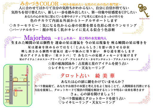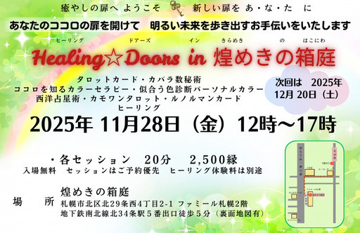 開催場所 煌めきの箱庭:札幌市北区北29条西4丁目2-1 ファミール2階205 煌めきの箱庭地下鉄南北線北34条駅 5番出口より徒歩5分🌟Healing☆Doors🌟 ―癒やしの扉を開く、あなたのための特別な時間―「なんとなく気持ちが沈んでいる」「自分らしさを見失っている気がする」 そんなふうに感じることはありませんか?Healing☆Doorsは、毎月開催される“癒し”と“気づき”のイベントです。 3人のセラピストが、それぞれの専門分野を活かして、あなたの心にそっと寄り添います。 タロット、カラーセラピー、占星術、ヒーリングなど、多彩なメニューをご用意。 どれも、あなたの「本当の気持ち」に気づくきっかけとなるものばかりです。このイベントのテーマは「扉」。 それは、あなたの心の奥にある“まだ開いていない可能性”の扉。 Healing☆Doorsでは、その扉をそっと開くお手伝いをします。 自分をもっと好きになる、自分らしく生きる、未来に希望を持つ―― そんな一歩を踏み出すためのヒントが、きっと見つかります。🌈初めての方も大歓迎! 「占いやセラピーは初めてで不安…」という方も、安心してご参加いただけます。 リラックスできる空間で、気軽に体験できるスタイルなので、 お友達と一緒に、またはおひとりでも、どうぞお気軽にお越しください。✨Healing☆Doorsは、あなたの“変わりたい”を応援する場所です。 癒しの扉を開いて、新しい自分に出会ってみませんか?Healing☆Doors癒やしの扉へ ようこそ新しい扉を あなたに心の扉を開けて 明るい未来を 歩き出すお手伝いをいたします タロット占い綺美華あなたは心の扉に鍵をかけていませんか?カバラ数秘術で、あなたやお相手の本質と考え方をよく知ることで、人間関係を円滑にする方法を提案し、タロットカードで現状の問題を解決するヒントや明るい未来を導きますさぁ、心の扉を開けましょう!♡カバラ数秘術とタロットカードを使う占い♡レイキヒーリング・天女ヒーリング みかづきColor~何かを始めたい女性のための色の専門家~人に合わせてばかりで自分の気持ちがわからない、自分に自信が持てない気持ちを切り替えたい、新しい一歩を踏み出したい、第一印象や好感度をUPしたいあなたの心が本当に望んでいる事やポジティブな考えに変わるきっかけ作りを色のチカラで内面&外面からトータルサポートします♢カラーセラピー:気になる色から心身の状態を探る色彩心理カウンセリング♢パーソナルカラー:顔が明るく肌がキレイに見える似合う色診断 Majorhea~星と時の水先案内人~生まれた瞬間の星は個性を 運命の星は運氣を 今の星は現象を 座る瞬間の星は導きを星は運命を決めるのではなく「じぶんらしさ」を思い出させる存在映し出される個性や運氣は 迷いや悩みに寄り添い 歩む道を照らします 星のアイテムを使い「星コトバ」で あなたへの応援メッセージを届けます 星のアイテム:ホロスコープリーディング・アストロダイス・カモワンタロット・プチルノルマンカード・神託のタロット☆星の航海図詠み:占星術と星のアイテムを使う占い☆レイキヒーリング・天女ヒーリング
