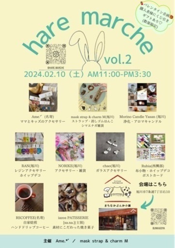 Hare marche 第2回目を開催させていただきます!旭川冬まつり&氷彫刻世界大会開催期間中ですので是非お立ち寄りください。ハンドメイドアクセサリー・雑貨、無添加焼き菓子・ベーグル、自家焙煎ハンドドリップコーヒー購入者様特典くじ引きにてバレンタインプチギフト(数量限定)