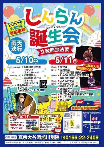ご覧頂きありがとうございますイベントの予告ですチラシは昨年のです今年分は現在作成中です旭川市宮下通2丁目1463番地にある真宗大谷派旭川別院、お寺ですイベント開催に伴い出店していただけるキッチンカー等を募集致します開催名【しんらん誕生会】しんらんたんじょうえ①期日 2026年5月10日(日)②時間 11時から16時頃まで③台数 全5台 予定④最低売上補償 15,000円 予定⑤販売内容が重複した場合は、お断りさせて頂く場合がございます⑥ その他・電気設備はありません・発電機の持込可能・ゴミはお持ち帰りください・当日の来院対応時間は、9時以降・イベント内容の宣伝については、別院HP、地元広報誌にて2回の広告、近隣住民や附属幼稚園にチラシの配布を行う予定です。・差し支え無ければ、店舗名や写真などを掲載し、PRさせて頂きます。昨年までの開催の様子を旭川別院ホームページに掲載してますぜひそちらもご覧ください申込方法①店舗名②販売内容を記入の上、メールで問い合わせ下さいご不明点がございましたら下記までお願いします旭川別院0166222409 担当ヨコイ(事務対応時間9時〜15時まで)
