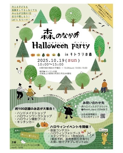 いよいよ森のなかのHalloween partyまであと1週間となりました‼︎毎日楽しみでわくわくが止まらない👻キトウシの森に北海道各地から約100店舗の豪華すぎる出店者様が集結!仮装はしてもしなくても楽しめますがぜひ仮装して参加してほしい🩷SNS仮装コンテストも景品が多いので沢山の方にお届けできると思います!ぜひご参加下さい🩷出店者様募集も残り枠わずかです!ご連絡お待ちしております【森のなかのHalloween party inキトウシの森】場所▶︎キトウシの森日時▶︎2025.10/19(日)10:00-15:00開催19日中止の場合は予備日10/26(日)に変更