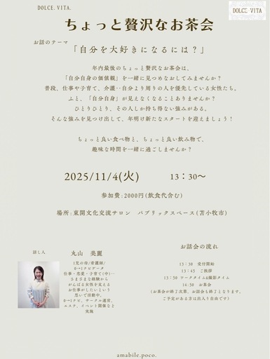 毎月開催しているちょっと贅沢なお茶会🍵年内最後の開催です。毎日が何となくつまらなかったり時間に追われてなんだかよくわからないうちに毎日が終わっている‥そんな方はいませか?一緒に自分を大好きになるよう見つめ直してみませんか?