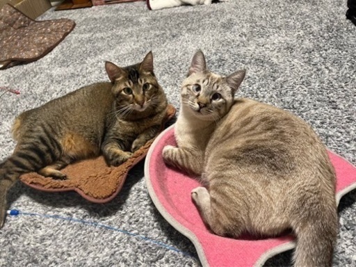 ◆性格や特徴道路で保護された子たち。飼い主不在は確認済みです。この子達は、パルボウイルスに罹患し、入院し輸血も行い、そして、元気に退院してきた子たちです。今後、2度とパルボウイルスに感染しない強い体を手に入れました(๑>◡<๑)頑張り屋さんの2人です。今後特に何か必要だということもなく、普通に生活できます!困ることもありません。タワー登りもします。先住猫さんにうつることもありません。現在札幌のお家で里親さんを待っています!共に男の子キジ 体重6kgシャム風 体重7kgとにかく人が好きで、なでるとすぐごろごろいいます。縦抱っこがお気に入り!2人で駆け回るのが大好きです!思い立ったように急に甘えて、ずーっとついて歩きます。夜も寄り添って寝たい子たちです。食欲はかなり旺盛です。他の猫ちゃんの分も食べます。パルボの後遺症として、腰から下のふらつきがたまにありますが、この子達は軽度です。何か困ることはありません。あまり高いところはジャンプはできません!頑張った2人一緒に新しいお家に行けたら良いと思っています。とても仲良しなので。他に仲良しの男の子が1匹います。人が好きなので、たくさん遊んでくれるお家の方に譲渡したいと考えています!二人ともマイクロチップ装着済み◆健康状態良好です猫エイズ(−)猫白血病(−)◆その他まずはこの子達を自宅へ連れて行き、面談をしてからお話を進めさせていただきます。(遠方の方は要相談です)本人確認のため、免許証または保険証の提示をお願いしています。譲渡費用として、病院代の一部、虫下し、去勢、マイクロチップ、ワクチン代で一匹あたり25000円となります。二匹で50000円です。(領収書、証明書はお渡しします)60歳以上の方単身の方には後継人様をお願いしています完全室内飼いで、リードをつけての散歩も禁止とさせていただきます。写真も時々送って欲しいと思います。まずはお会いしてお話してから、進めていく形になります!