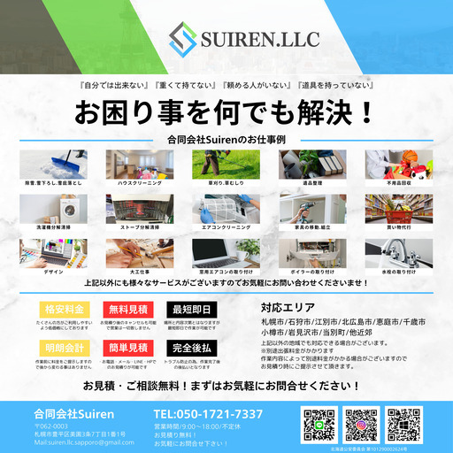 大小関係なくご対応するという事をモットーにやらせて頂いております!★お見積りは無料となります。★最短即日ご対応可能な場合もございます。【作業内容】・窓用エアコン取付けor取り外し※上記以外の事も対応可能となりますのでお問い合わせください。【お困り例】・窓用エアコンの取付けをしてほしい・引っ越すので窓用エアコンの取り外しをしてほしい・冬場なので窓用エアコンの取り外しをしてほしい・中古で買った窓用エアコンの取付けをしてほしい【料金】1台9,900円(税込)【対応エリア】[無料]・札幌市[2,200円]・石狩市 ・北広島市 ・江別市 ・恵庭市[6,600円]・小樽市 ・岩見沢市 ・当別町 ・千歳市 ・他【作業について】・施工前後の写真を撮影させて頂きSNSやHPに掲載させて頂く場合がございます。・夜間早朝も状況に応じて対応可能です。・技術があるスタッフがお伺い致します。【注意事項】・作業前日や当日のキャンセルはキャンセル料金がかかります。・危険作業で、作業員の安全が確保できない場合は、お断りする場合があります。・明確な料金をお伝えするため、必ずお客様の状況を細かくお伝えください。【キャンセル料金】当日…見積り料金の100%前日…見積り料金の50%★☆★☆★☆★☆★☆★☆★☆★☆★☆★☆合同会社Suiren【住所】札幌市豊平区美園3条7丁目1番1【LINE】@413krdyr【営業時間】9:00~18:00 不定休