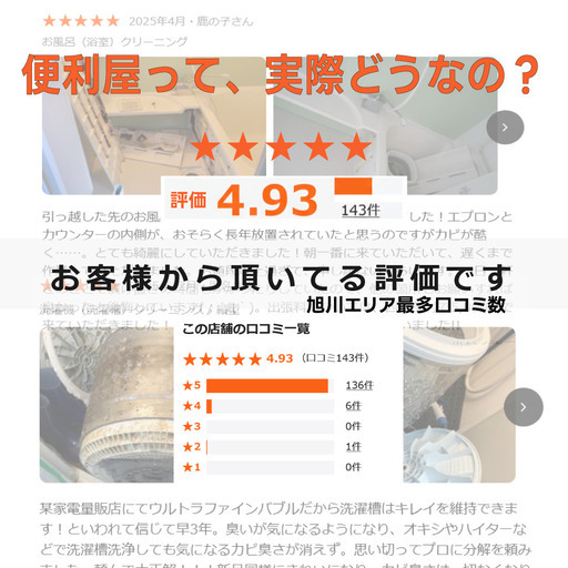水回りのカビ・水垢・黒ずみ、あきらめていませんか?当店は時間制限を設けていません。汚れに合わせて 6~12時間かけて徹底清掃 するのが特徴です。「ここまでやってくれるとは思わなかった」と多くのお客様からお声をいただいています。某大手サイトにて旭川エリア出店8店中口コミ総数219件 → 当店143件評価 4.93 を維持しています。多くのご依頼をいただいてきた実績です。安心してご相談ください。店長の私が、見積り~作業完了まで責任を持って対応します。◇作業時間目安:6~12時間◇6時間以内に返信対応いたします◇在室・空室どちらも対応可能■水回りクリーニングキッチン:14,000円換気扇:13,000円お風呂:15,000円洗面台:8,000円トイレ:8,000円【セットがお得です】2点:24,000円~3点:32,000円4点:38,000円5点:43,000円インスタに実際の施工を掲載しています https://www.instagram.com/ossan_suketto/LINEからのご依頼で 5%OFF現金・クレジットカード対応カビ・水垢・黒ずみでお困りの方、お気軽にご相談ください。【お問い合わせは】電話:(050) 3631-0156LINE@ https://lin.ee/1BEmrjK