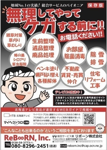 ☆☆☆コロナウィルス対策☆☆☆外から帰って来ると、自分の部屋の匂いが気になる…。そんな経験はありませんか?お部屋の生活臭やタバコの臭い・ペット臭などは一度室内に染み付いてしまうと、ファブリーズ等の除菌消臭剤ではなかなか簡単に取ることができません。部屋の気になる匂いを、匂いのもとからシャットダウンできるよう消臭・除菌を行っています。部屋の匂いでお悩みの方はぜひ一度ご相談下さい。また、部屋全体の除菌・消毒も行なっておりますので、新居にご入居される前などには、ハウスクリーニングと合わせて行っていただくと安心です。臭いを気にせず、快適な空間で過ごしていただけます。地域NO.1の実績!総合サービスのパイオニア〜総合サービス業〜 ReB∞RN,Inc.(リボーン インク) <a href=" https://youtu.be/W7taX3h5Wug">HTB北海道テレビで放送中の【マイベストプロ北海道 】テレビCM 【Ver.8.4】</a>マイベストプロで紹介されました!新聞社・テレビ局が運営だから安心!まちの専門家で問題解決!新聞社・テレビ局が運営してる全国の専門家紹介サイト『マイベストプロ』さんの方から取材および掲載のご依頼をいただき、当社が紹介されました。<a href=" https://mbp-japan.com/hokkaido/reborn/">プロフィールはこちらからご覧下さい</a>古物商許可証 取得日本便利屋技能検定協会 認定 お見積り・大歓迎です‼︎ 『こんなことも出来るのか』というご相談を承っております!!お掃除・片付け・洗濯・家具の移動・ 生前整理・遺品整理・草刈り・買い物・病院付き添い・ お墓の掃除・安否確認・電球の交換・タイヤ交換・除排雪など… ジモティなどでの、家具など大型商品を集荷し配達なども致します。上記以外にも、どんな小さな事でもお気軽にご連絡ください‼︎ PayPay(ペイペイ)使えます!お客様の【ありがとう】の一言をいただけるよう真っすぐにいつも笑顔で、誠実に対応させて頂きます。 お問い合わせ・ご相談だけでも 本当に嬉しいです。 初めての方も安心してReB∞RN,Inc.までご連絡下さいませ‼︎ https://reborncoah.wixsite.com/rebrninc-1※ご連絡の際は【ジモティーを見た】と伝言頂ければ大変助かります。