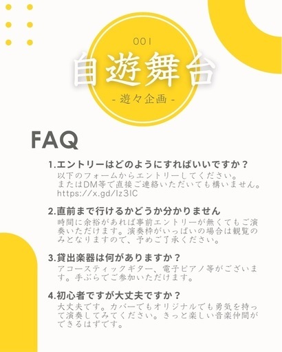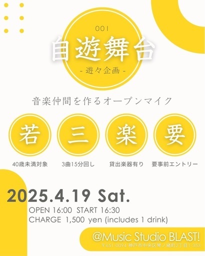 2025年4月19日(土)に弾き語りをされる方に向けたオープンマイクを神戸三宮で企画しています🎸🎹40歳未満を対象としているので年齢の近い音楽仲間を作るチャンスです🤝新生活の始まりとともに新しい友だちを作りましょう!😆出演を希望される方は以下のURLのフォームからエントリーをお願いします😊 https://x.gd/Iz3lC