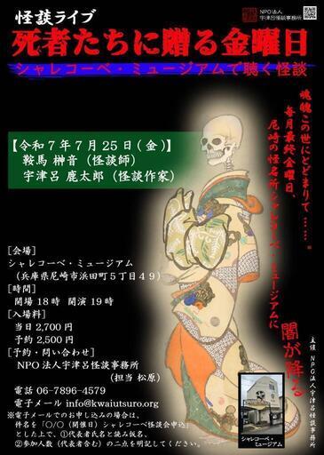 7月25日(金)シャレコウベミュージアム開幕18時 開演19時出演︰宇津吕 鹿太郎(怪談作家)、鞍馬榊音(怪談師)前売り︰2500円当日︰2700円骸骨達の集まる怪しげな空間で、極上の怪談を味わってください。阪神電車『センタープール前』駅の北口より北へ徒歩17分です。JR『立花』駅の南口より南へ徒歩18分です。最寄りのバス停は『南浜田』と『南警察署西分庁舎』です。『南浜田』へのバスは『阪神尼崎駅北』から宝塚宝塚線か、尼崎西宮線にお乗りください。『南警察署西分庁舎』へのバスは『阪急塚口』か『JR立花』から武庫川行きの30番にお乗りください。