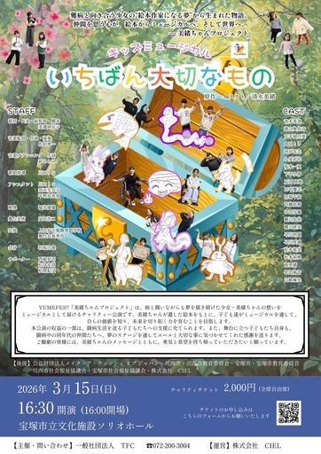 【地域の子どもたちがつくる、感動のステージ】3月15日(日)、宝塚市ソリオホールにてキッズミュージカル『いちばん大切なもの』を上演します!この物語の原作は、難病と向き合っていた一人の女の子、美緒ちゃんが描いた一冊の絵本です。「絵本作家になりたい」という彼女の夢を受け継ぎ、地域の子どもたちが歌とダンスで命を吹き込みます。★ここがオススメ!• 親子観劇に最適! 同年代の子が一生懸命演じる姿は、お子様の情操教育にもぴったりです。• 社会貢献につながる チケット代などの収益は、闘病中の子どもたちへの支援金として寄付されます。• 宝塚ならではの本格舞台 オリジナル脚本と楽曲による、この日限りのパフォーマンスです。【公演詳細】• 日時:2026年3月15日(日)• 場所:宝塚市ソリオホール(宝塚駅すぐ)• 演目:チャリティーミュージカル『いちばん大切なもの』• チケット:2,000円(全席自由)→当日のチケットブースでお買い求めください※小学生以下のお子様は保護者の方同伴で無料となりますご家族、お友達、ご近所お誘い合わせの上、ぜひ子どもたちの勇姿を応援しに来てください!【お申し込み・お問い合わせ】詳細やチケットのご予約は、お気軽にメッセージをください。