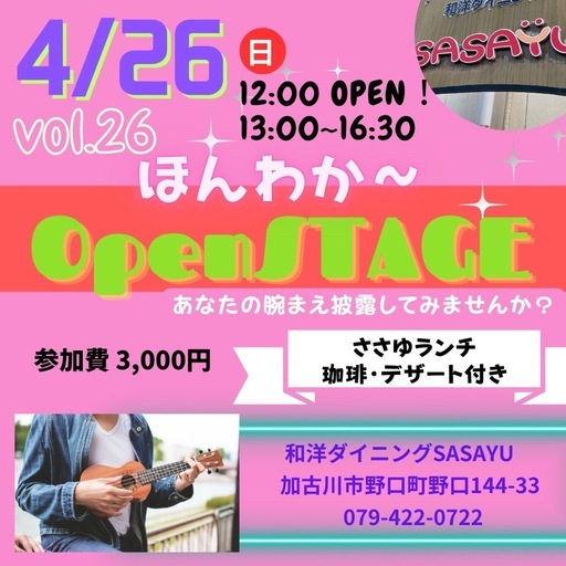 初めましてさまも歓迎!ほんわかとした空間で一組15分の持ち時間を自由にパフォーマンスしてください!11組までの募集となっております😊お問い合わせくださいね♪