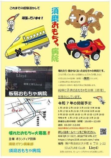 ボランティア団体 須磨オヤジ倶楽部主催 須磨おもちゃ病院 板宿病院 壊れたおもちゃを無料で治します(使用パーツ·電池なとは、有料) 毎月第三土曜日板宿おもちゃ病院 毎月第二または、第四木曜日にホワイトヒルおもちゃ病院を開催しております 開催地場所 開催日時詳しくは、ホームページをご覧下さい。お問い合わせは、ホームページチャットからお願いします https://chqnc218.wixsite.com/-site 尚、カルチャークラブロイド閉鎖に伴い、現在の受付をもって一旦終了 いたします。新しい開催場所が決まり次第、再開いたします。