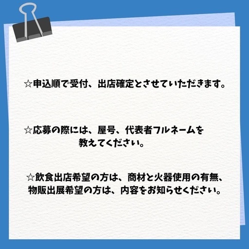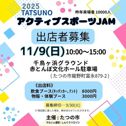 例年開催しております たつの市主催のイベントです。こちらに出店いただける飲食、物販、体験の出店者様を募集しております。現段階で、飲食ブースに人気メニュー(唐揚げ、ポテト、ベビーカステラ、焼きそば、たこ焼き)の応募を多数いただいております。申し訳ございませんが、それ以外の出店品目の店舗様に限らせていただきます。申し込み、お問い合わせは、マルシェ担当「しんぐうリエゾン」へメッセージをお待ちしております。よろしくお願いします。