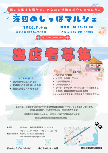 保護犬の譲渡会とチャリティマルシェをあわせた**「海辺のしっぽマルシェ」**を開催します。本イベントは、保護犬たちが人と出会い、来場者が楽しみながら動物福祉について知り、応援できるあたたかなマルシェを目指しています。当日は、ハンドメイド雑貨・ペットグッズ・ワークショップなど、想いに共感してくださるテント出店者さまを募集しています。★テントショップ 残り1枠となりました。お急ぎください★「動物が好き」「地域イベントに関わってみたい」「チャリティに参加してみたい」そんな方のご参加を歓迎します。初出店の方も歓迎です屋外イベントのため、簡易テントをご持参くださいイベントの詳細、出店条件、お申込みは下記特設サイトよりご確認ください。▶ 特設サイト https://ashiatomonogatari.online/※お申込みはホームページ内の申込みフォームからお願いします。※ご不明な点がございましたら、お気軽にお問い合わせください。
