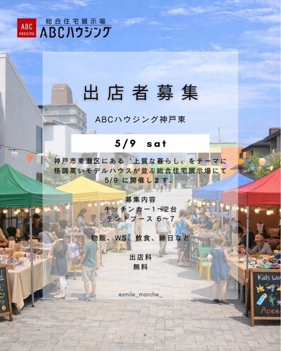 『出店者募集ABCハウジング神戸東スマイルマルシェ』⚫︎イベント概要ABCハウジング神戸東の里住宅公園にて開催するハンドメイド作品やワークショップや物販や飲食ブースなど集まるマルシェ⚫︎募集内容飲食ブース、ファミリー・お子様向けワークショップ、その他体験イベント、雑貨販売、キッチンカーなど⚫︎出店料無料⚫︎開催日・開催時間2026年5月9日(土)11:00~17:00⚫︎募集数テントブース5〜6ブースキッチンカー2台⚫︎住所(開催地)ABCハウジング神戸東〒658-0012兵庫県神戸市東灘区本庄町3-2-14当日「すまいのアンケート」にご回答頂いたご来場者様に先着100名様にで当日マルシェにて使える300~500円の金券のお渡しします。その金券はイベント終了後、現金に交換させて頂きます。⚫︎申し込みフォーム https://forms.gle/5GWg48LAPdatZjXq6⚫︎締め切り2月25日#出店者募集中#出店者募集