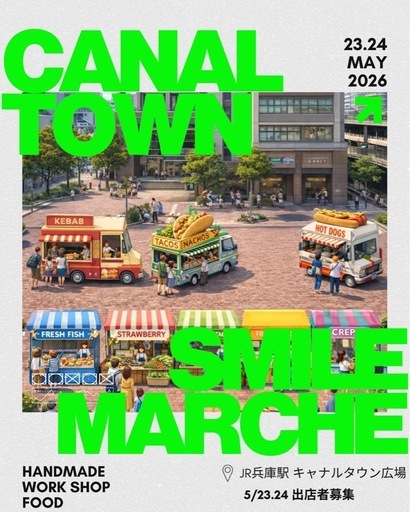 兵庫駅前キャナルタウン広場出店者募集要項『スマイルマルシェ』⚫︎イベント概要兵庫駅直結の駅前広場にて開催するハンドメイド作品やワークショップや物販やキッチンカーなど集まるマルシェ⚫︎開催日・開催時間2026年5月23.24日11:00〜19:00⚫︎住所(開催地)キャナルタウン広場兵庫県神戸市兵庫区駅南通5-1「JR兵庫駅」を出てすぐの広々とした屋外スペースです。駅前を訪れる人々が快適に過ごせる居心地の良い空間ある広場です。⚫︎募集内容キッチンカー8台、マルシェ(ハンドメイド、ワークショップ、フリマ、飲食など25ブース⚫︎出店料・物販、キッズブース 、ワークショップ 、飲食テントブース4800円↑いずれも3m角・キッチンカー5800円・企業ブース 30,000円2日間3m×3m 9000円キッチンカー 11,000円企業ブース50,000円⚫︎応募方法申し込みフォームでお願いします。↓ https://forms.gle/5H4rxrVWAY9JwtBs6ストーリーのハイライトに掲載しておきます。そちらから申し込みフォームへリンクされます。⚫︎募集締切3月30日⚫︎注意事項* テントや什器など必要な備品は各自用意ください。* テントの大きさは指定のブースサイズを超えることは不可とします。* 電気の使用は基本的に出来ません。* 1店舗に複数の作家様での共同出展も可能です。* 1店舗で複数区画の予約は可能です。*ブランドコピー品、版権物をあしらった作品の出展はできません。* 時間指定で会場まで車両での搬入・搬出が可能です。*搬入・搬出の際はスタッフの指示に従ってもらいます。*くれぐれも事故などがないようにお願いします。* 入金後の返金・及び不開催の場合でも返金はできません。 * 台風や荒天の場合、イベント開催が困難と判断した時中止になる場合があります。* 不開催の場合の予備日はありません。(小雨開催)* 販売中、ブースでの喫煙はできません。* 排水、給水はありません。* 出店確定メールの後のキャンセルはキャンセル料が発生します。⚫︎主催者お問い合わせ先Instagramアカウント(必須)@smile_marche_#スマイルマルシェ #マルシェ#出店者募集 #出店者募集中