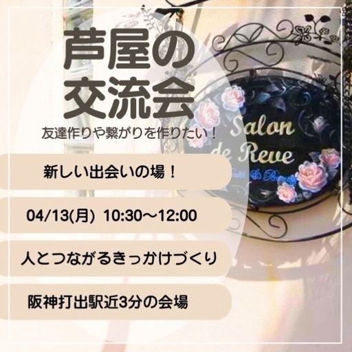 【イベント概要】芦屋の隠れ家サロンで、お茶とお菓子を囲んでほっと一息。ご縁が広がる少人数交流会です。━━━━━━━━━━━━━━━◆ 日時2026年4月13日(月)10:30〜12:00━━━━━━━━━━━━━━━◆ 場所サロンドレェーヴ芦屋(芦屋市打出小槌町11-9)・阪神「打出駅」徒歩3分・JR「芦屋駅」徒歩15分※こちらの看板が目印の白い一軒家です※道順が不安な方は事前にご連絡ください━━━━━━━━━━━━━━━◆ 定員5名(少人数制/先着順)━━━━━━━━━━━━━━━◆ 参加費1,000円(お茶・お菓子つき)リピーター様 500円その場で次回予約 無料━━━━━━━━━━━━━━━◆ ご挨拶人との出会いは、人生を変えるきっかけにもなります。出会いのきっかけは、意外とささいなところから…*この交流会は、「芦屋・西宮って、交流会が少ないよね」という声と、「サロンドレェーヴという素敵なサロンをもっと知ってほしい」という想いから生まれました。*まずはここで、あなたと誰かがつながるきっかけに*ゆったりとした時間の中で、自然なご縁が広がっていく場になればうれしいです。 ━━━━━━━━━━━━━━━◆ サロンドレェーヴってどんな場所?・エステベッドあり・ネイルサロン設備あり(貸出OK)・ピアノあり(サロンコンサート可)・キッチン付き(お料理会にも対応)施術/音楽/料理/イベント…夢を叶える多目的なレンタルスペースです♪━━━━━━━━━━━━━━━◆ 当日の流れ(予定)1)受付・参加費お支払い2)手洗い・着席3)自己紹介カード記入4)ゆるっと自己紹介5)おしゃべり・交流タイム6)連絡先交換(希望者のみ) ━━━━━━━━━━━━━━━◆ こんな方におすすめ・友達づくりをしたい方・趣味について語り合いたい方・いろんな価値観に触れてみたい方・新しい出会いがほしい方・職場以外で人とつながりたい方・芦屋・西宮エリアのご縁を広げたい方・誰かとゆるくつながりたい方 ━━━━━━━━━━━━━━━◆ 主催者紹介◎ aya東京と芦屋の2拠点で生活。ネイルサロンと栄養指導の事業を運営中。妊娠をきっかけに「食・心・体」のバランスを大切にした生き方を実践中。◎ mami食育アドバイザーとして活動。ヘルシービュッフェやスイーツイベントを主催し、「食を通じた心と体のケア」を提案しています。\2人で運営する交流会は、ありのままの自分で過ごせる“安心の場”を目指しています/「夢」や「ご縁」が自然とつながっていくような時間になりますように*━━━━━━━━━━━━━━━◆ ご協力のお願い(注意事項)・会場は靴を脱いでお入りいただくスタイルです(スリッパあり)・遅刻・キャンセルは必ず【こくちーず】上からご連絡ください・準備の都合上、前日までのキャンセル連絡にご協力をお願いします・当日のキャンセルにつきましては、参加費の100%を頂戴いたします(無断キャンセルを防ぐための措置です。どうぞご理解くださいませ)・定員に達し次第、受付を終了いたします・※宗教活動・宗教の勧誘目的でのご参加はお断りしております━━━━━━━━━━━━━━━このページを通じて、「ちょっと行ってみようかな…」と思っていただけたら嬉しいです。どうぞお気軽にご参加ください♪