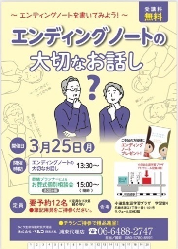 『エンディングノートとは....?」『エンディングノートの大事なお話し』一緒に考えながら書いてみましょう♪この機会に終活についての心配事、悩み、お葬儀の疑問、不安、全て解決しましょう♪個別無料相談、同時開催🌟定員12名定員になり次第、締め切ります🙇♀️ご参加の方皆様にエンディングノートをプレゼント🎁事前予約でお土産付き😌✨【持物】筆記用具【日時】2024年 3/25(月)【時間】◯エンディングノートの書き方 13:30〜※ 要予約◯お葬式個別相談会(各20分枠) 15:00〜※要予約【料金】 無料※アンケートの記入をお願いします。【場所】 小田北生涯学習プラザ 学習室4 尼崎市潮江1丁目11番1-101号 ラ・ヴェール尼崎2階#ベルコ駅前ホール#尼崎#尼崎イベント#家族葬の疑問#家族葬#葬儀費用#お葬儀#エンディングノート#エンディングノートの書き方#浦東代理店 #浦東代理店イベント#浦東代理店フォト#浦東代理店0円交換会