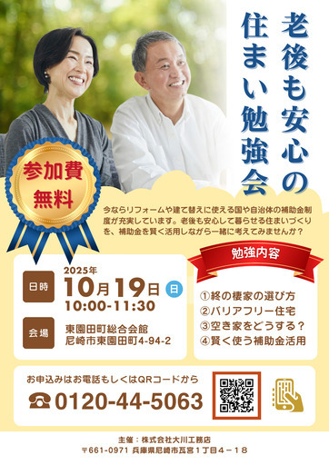 「これからの暮らし、どう準備する?」そんなお悩みにお答えする勉強会を開催します!リフォーム最大200万、給湯器に最大20万、など補助金についても学べます📚🔹 終の棲家の選び方🔹 バリアフリー住宅について🔹 空き家の活用方法🔹 補助金の賢い使い方安心して暮らすためのヒントがいっぱいです😊📅 日時:2025年10月19日(日)10:00〜11:30📍 会場:東園田町総合会館 尼崎市東園田町4-94-2お申込みはお気軽に📞 0120-44-5063またはメッセージからどうぞ!👉 将来を考え始めた方、ご家族での参加も大歓迎です✨