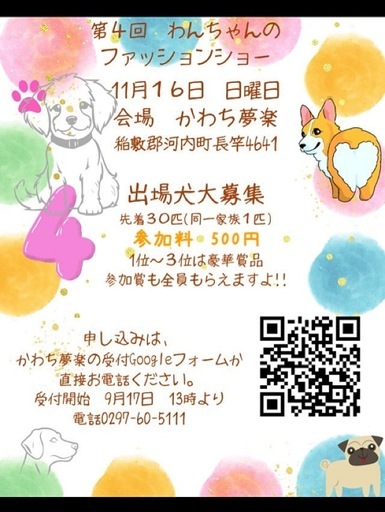 毎年の大好評の、かわち夢楽『ワンフェス』の第4回わんちゃんのファッションショーの、出場犬さんの募集をいたします。Googleフォームか、かわち夢楽にお電話にて受け致します。先着30犬さま (同家族1匹)1位〜3位は、豪華商品が貰えます。また、参加賞も全員貰えます。※参加料 500円 当日受付にて頂きます受け開始9月17日 13時より電話 0297 60 511130匹に達した時点で締め切ります。かわち夢楽 稲敷郡河内町長竿4641@kawachimura.town.kawachi #かわち夢楽#茨城県稲敷郡河内#ワンフェス#ワンちゃんのファッションショー#出場犬募集中