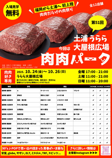 人気店、市外県外から全12店舗【 肉肉だらけの肉祭り 肉肉パーク うらら大屋根広場】うらら大屋根広場で初開催!みんな大好き、お肉料理が大集合!各店ご自慢のお肉料理を提供。中には肉肉パーク限定メニューも。【開催日】10. 24 (金)〜 10. 26(日)【開催時間】金曜 17時 〜 21時 土曜 11時 〜 21時 日曜 11時 〜 20時【開催場所】うらら大屋根広場【主催 時松のインスタグラム】 https://www.instagram.com/sunao_tokimatsu/【主催】 肉肉パーク実行委員会【後援】土浦市