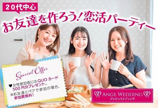 同年代の方が集まる恋活パーティー☆まずはお友達を作る気軽な気持ちでお越し下さい!マッチングアプリと違って、短時間で複数の方と直接会って、1対1でお話が出来るから、効率的で安心です!連絡先交換自由のパーティーだから、次に繋がるチャンスも大きい!☆女性参加者には「QUOカード500円分」プレゼント!!お友達とペアでご参加の方はパーティー参加費無料とさせて頂きます。ご予約の際、備考欄にご友人の名前、年齢をご入力下さいませ。日時 5月2日(土)17:30~19:00場所 アンジュウエディング つくばサロン つくば市大角豆2012-125 ※無料駐車場完備となります。年齢 23~32歳参加人数 5対5 ※最少催行人数は3対3になります。 ※多少、男女差が生じても開催いたします。参加費用 男性5,000円 女性500円 ※受付にて現金にてお支払いをお願いいたしますお持ち物 筆記用具、身分証明書お申込みURL https://angewedding.com/events/20%e4%bb%a3%e4%b8%ad%e5%bf%83%e6%81%8b%e4%ba%ba%e3%82%92%e6%8e%a2%e3%81%9d%e3%81%86%e2%99%a5%e6%81%8b%e6%b4%bb%e3%83%91%e3%83%bc%e3%83%86%e3%82%a3%e3%80%9023%ef%bd%9e32%e6%ad%b3%e3%80%91-8皆様のご参加お待ちしております!