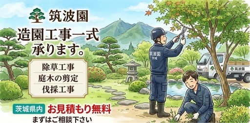 ご覧頂きありがとうございます!こちら県内を中心に活動させて頂いております筑波園と申します。「庭木が伸びてきたけど、どこに頼んで良いかわからない」「お見積もりだけでもして欲しい」「お見積もりだけで出張費がかかる?」「こんな工事、作業はして貰える?」そんなお悩みの方は、是非ご相談下さい!茨城県内お見積もり無料!1本〜でもご相談下さい。作業は経験年数17年のベテラン作業員が対応致します。写真などからの概算のお見積もりも対応させて頂きます!追加作業がない場合、お見積もり金額外の請求は一切致しません!お庭に限らず、空き地の除草、伐採も承ります!その他、芝張り作業、薬剤散布、防草シート施工、人口芝、その他外構工事など気になる方は、お気軽にお問い合わせ下さい!