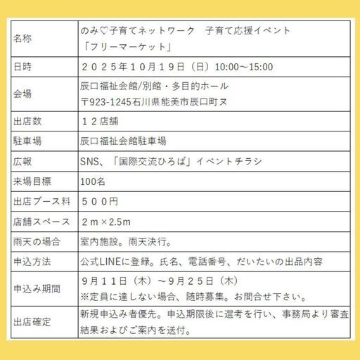 日時:2025年10月19日(日) 10:00~15:00会場:辰口福祉会館/別館・多目的ホール 〒923-1245石川県能美市辰口町ヌ出店数:12店舗駐車場:辰口福祉会館駐車場広報:SNS、「国際交流ひろば」イベントチラシ来場目標:100名出店ブース料:500円店舗スペース:2m×2.5m雨天の場合:室内施設。雨天決行。申込方法:公式LINEに登録。 https://lin.ee/LNkwJ7m 氏名、電話番号、だいたいの出品内容申込み期間:9月11日(木)~9月25日(木)※定員に達しない場合、随時募集。お問合せ下さい。"出店確定:新規申込み者優先。申込期限後に選考を行い、事務局より審査結果およびご案内を送付。