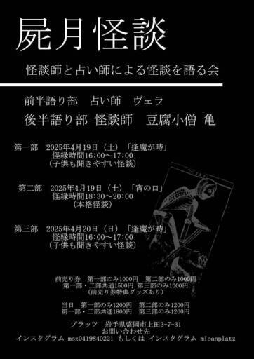 「みんなの場所Platz」〒020-0066 盛岡市上田3丁目7-31★4月19日 土曜日一部 16時~17時二部 18時半~20時★4月20日 日曜日三部 16時~17時前売り券、販売中‼️☆前売り券一部のみ 1000円二部のみ 1000円一部・二部共通 1500円三部のみ 1000円☆当日一部のみ 1200円二部のみ 1200円一部・二部共通 1800円三部のみ 1200円※定員に達し次第、チケットの販売はストップいたしますので、お早めに‼️ジモティメッセージにてご予約受付ます異色コラボの怪談語り手豆腐小僧亀 占い師ヴェラ